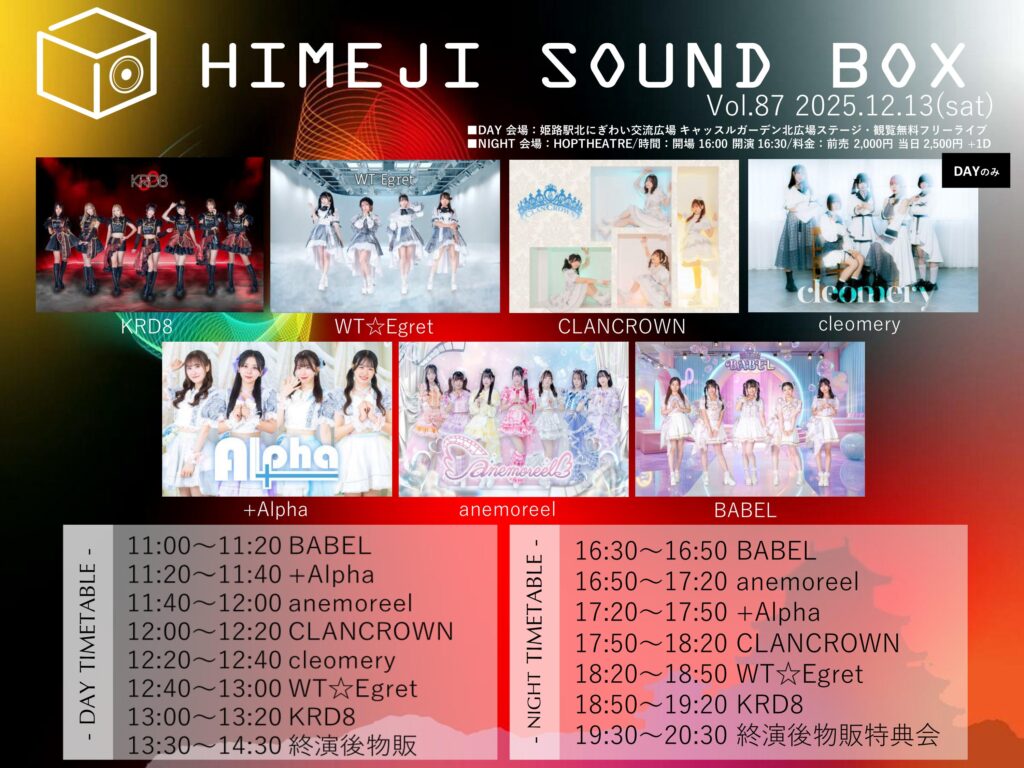 | HIMEJI SOUND BOX Vol.87 NIGHT🌙 開催日:2025年12月13日(土) 時間:開場16:00/開演16:30 会場:HOP THEATRE (兵庫県 姫路市 駅前町 247 御幸苑ビル地下1階) 出演: KRD8/WT☆Egret/BABEL/+Alpha /CLANCROWN /anemoree 料金:前売券2,000円/当日券2,500円 ※1ドリンク代500円別途必要 主催:一般社団法人 姫路応援プロジェクト 🎫https://tiget.net/events/445445 【注意事項】 ・入場は整理番号順の入場となります。 ・会場周辺での出待ち行為は固く お断りしております。 ・他のお客様のご迷惑となる行為、 又他のお客様に 怪我をさせてしまう可能性のある 危険な行為は禁止させていただきます。 ・会場内・外で発生した事故・盗難等は 主催者・会場・出演者は一切責任を負いません。 ・ライブ中の撮影可否については各出演者 のルールによります。 ・HOP所属グループについてはMC時のみ 静止画撮影可能です。 動画撮影については、 当日お知らせする撮影可能曲(1曲)のみ 客席後方の段を上がった場所であれば可能です。 それ以外の動画撮影・録音は禁止となります。 |