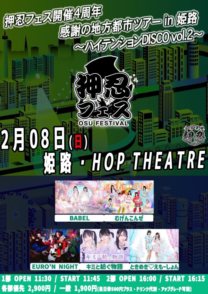 | 2月8日(日) 兵庫・姫路HOP THEATRE 「押忍フェス開催4周年 感謝の地方都市ツアー in 姫路〜ハイテンションDISCO vol.2〜」 <1部> OPEN 11:30 / START 11:45 前方優先 2,900円 / 一般 1,900円(ドリンク代別・当日券500円プラス・アップグレード可能) 出演:BABEL / キミと紡ぐ物語 / EURO'N NIGHT / むげんこんぜ / ときめき♡えもーしょん <2部> OPEN 16:00 / START 16:15 前方優先 2,900円 / 一般 1,900円(ドリンク代別・当日券500円プラス・アップグレード可能) 出演:BABEL / キミと紡ぐ物語 / EURO'N NIGHT / むげんこんぜ / ときめき♡えもーしょん 主催:合同会社押忍 <共有事項> ※入場は整理番号順です(前方優先→一般) ※OPEN / START時間が変更になる可能性があります <タイムテーブル> 11:30 1部OPEN 11:45-12:10 EURO'N NIGHT<12:20-13:20 並行物販> 12:15-12:40 ときめき♡えもーしょん 12:45-13:10 キミと紡ぐ物語 13:20-13:45 BABEL 13:50-14:15 むげんこんぜ 14:25-15:25 特典会 16:00 2部OPEN 16:15-16:40 ときめき♡えもーしょん<16:50-17:50 並行物販> 16:45-17:10 キミと紡ぐ物語 17:15-17:40 EURO'N NIGHT 17:50-18:15 むげんこんぜ 18:20-18:45 BABEL |
